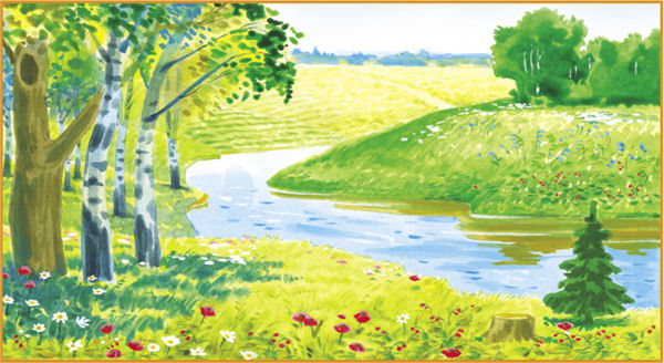 - Короните на дърветата са нарисувани по такъв начин, че да създават гъста гора, бреговете на реката са нарисувани подробно, а стволовете са засенчени.