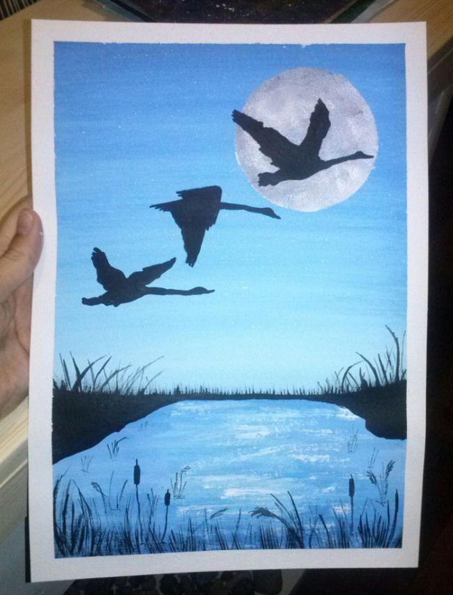 - Нарисувани са всички важни детайли на картината (патици, вълнички, гъста трева и клони).