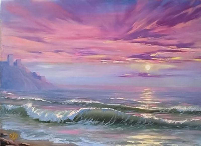 - Виолетовото оцветява облаците, жълтото - хълмовете и създава предния план.