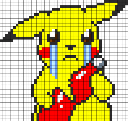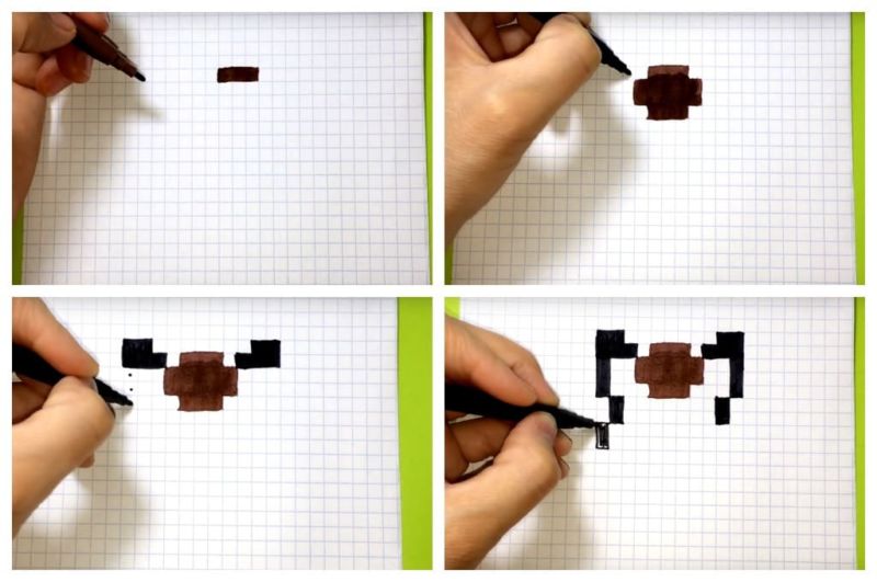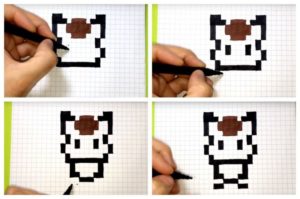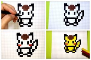 Лесно нарисувайте Пикачу в квадрати на лист хартия и успейте в стила на героите на Meincraft, чиято характерна черта е квадратното очертание на всеки детайл.