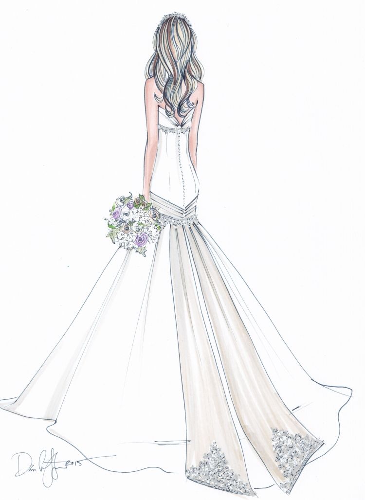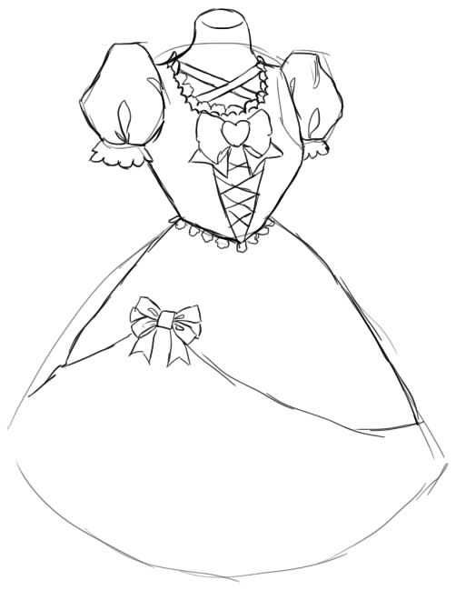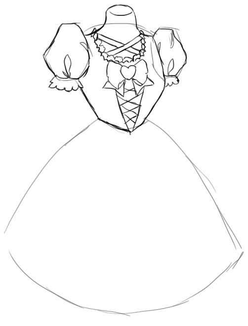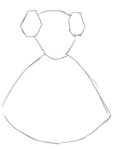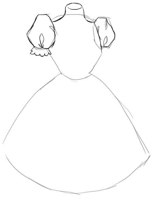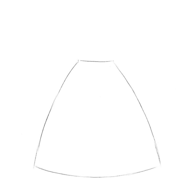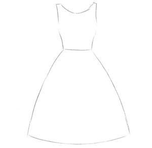 - От горните точки на фигурата се изтеглят две къси ленти в различни посоки, които след това се обръщат надолу. Контурите на двете линии са успоредни на V-образната форма, но художникът трябва да направи плавна извивка навън приблизително в средата на всяка линия. Корпусът на роклята е готов.