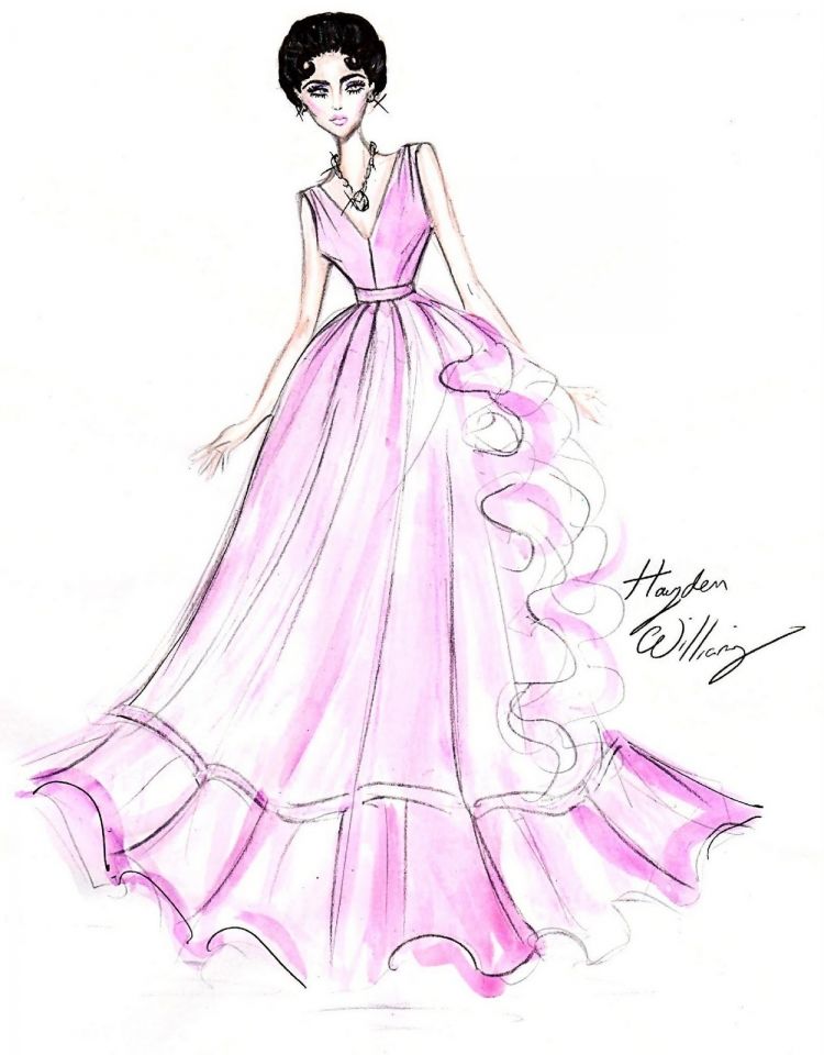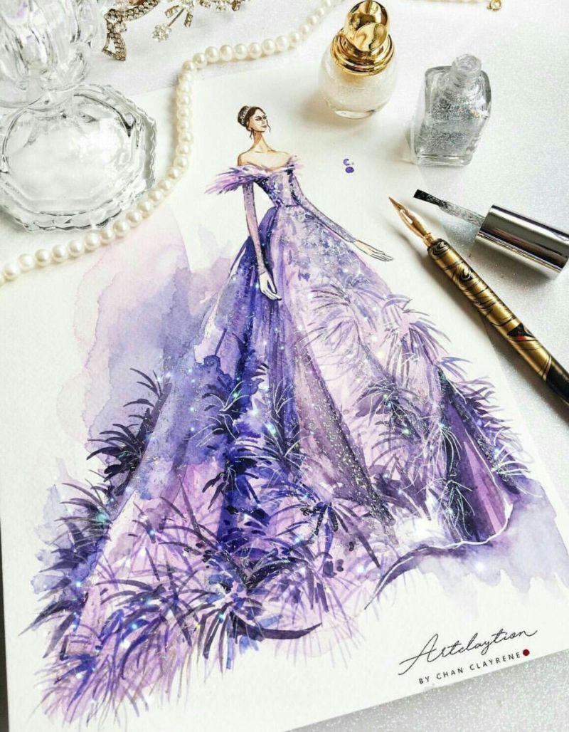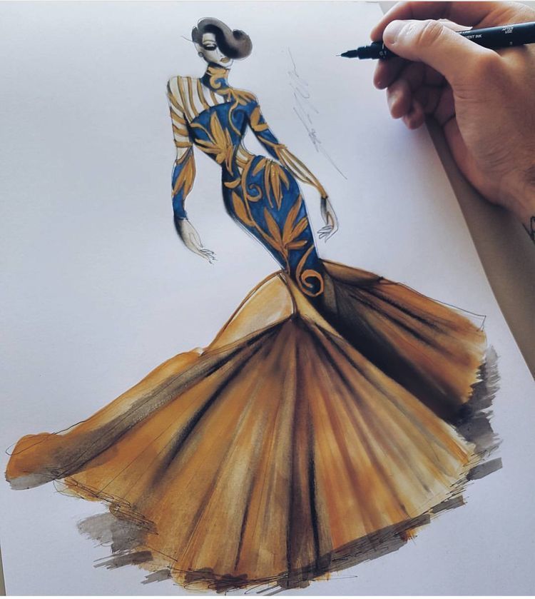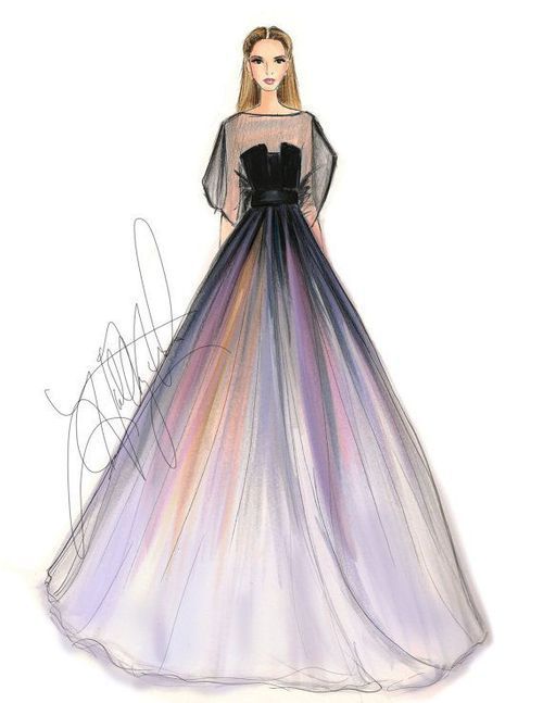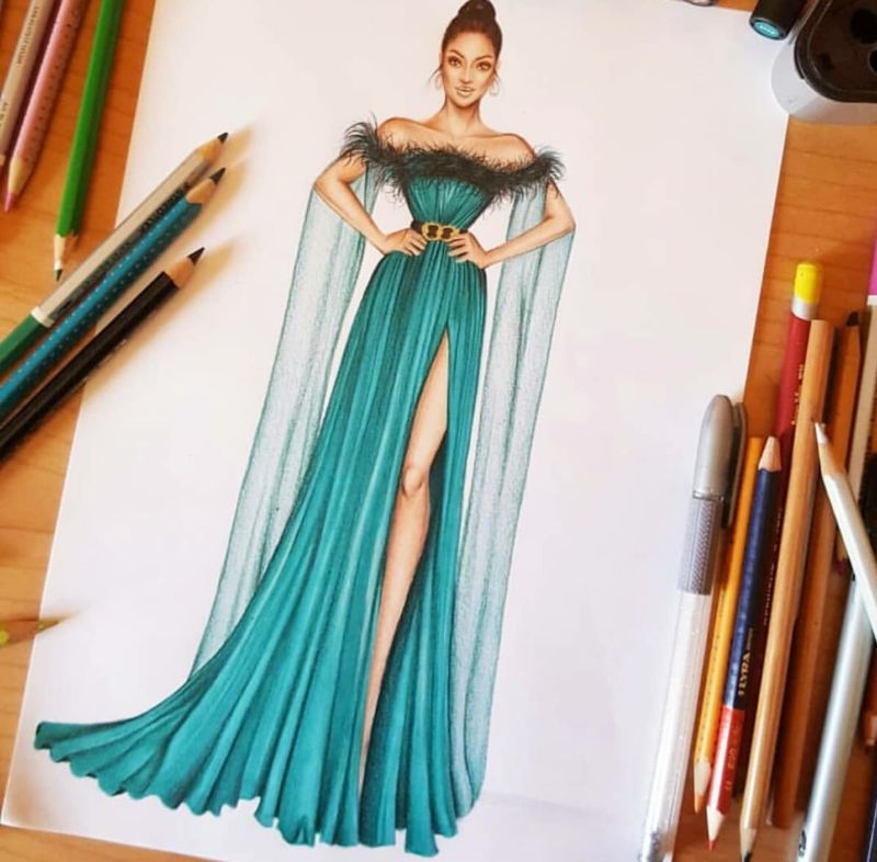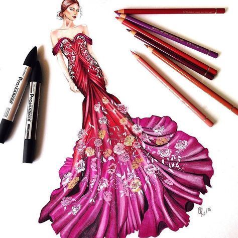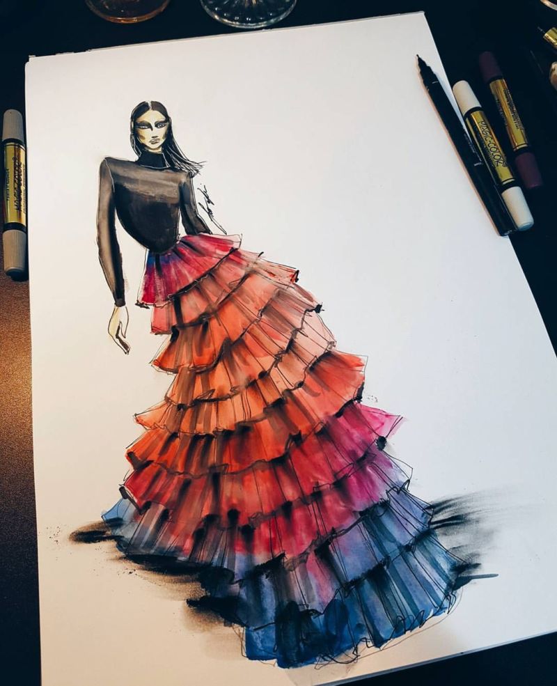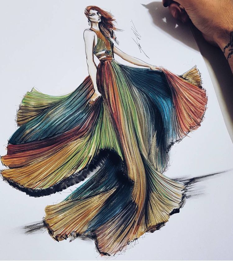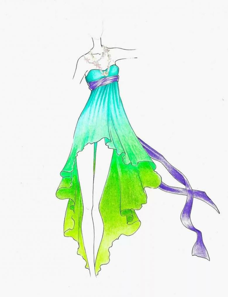 Можете да нарисувате рокля с пастелни моливи, които позволяват ретуширане на различни цветове и създаване на красиви градиенти.