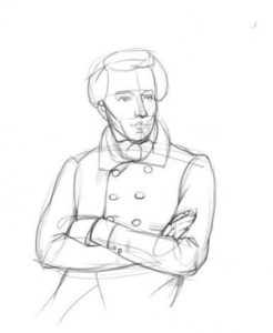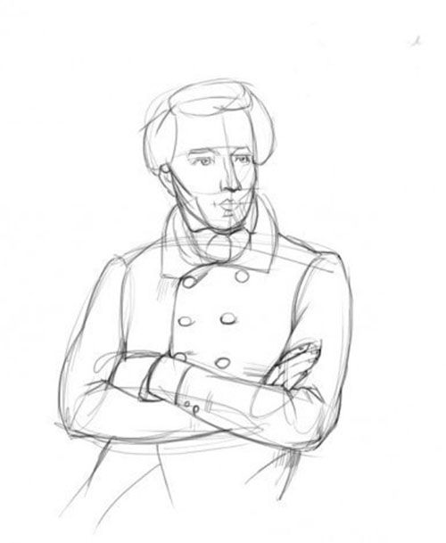 - Сега е време за подробна обработка на дрехите. В духа на времето е нарисувана риза, сюртук, шал с ревери, увит около врата. Палтото е с големи копчета на два реда. Сгънатите ръце също са очертани.