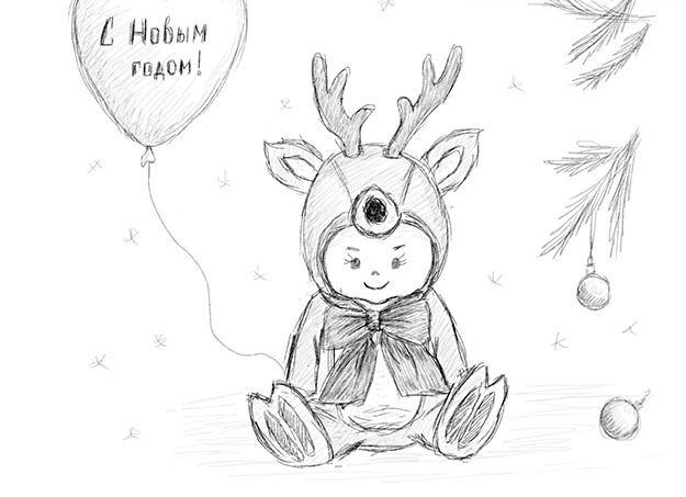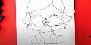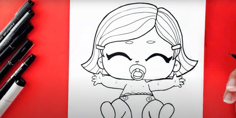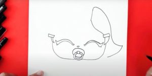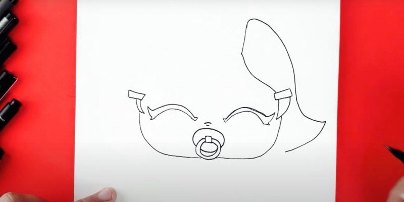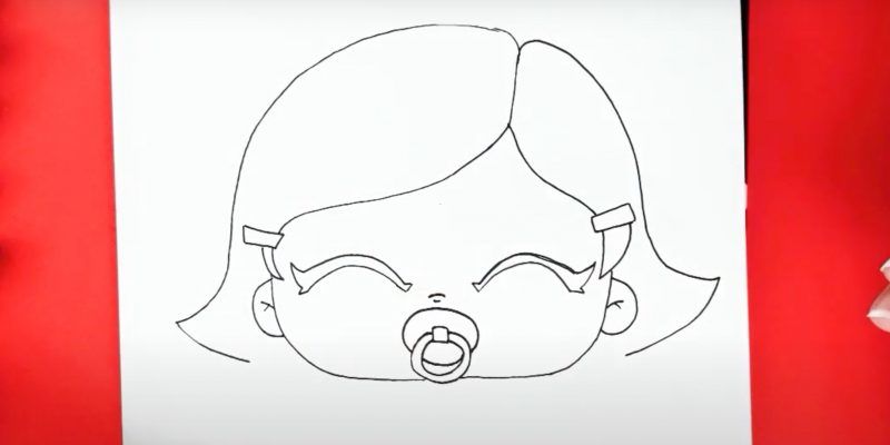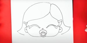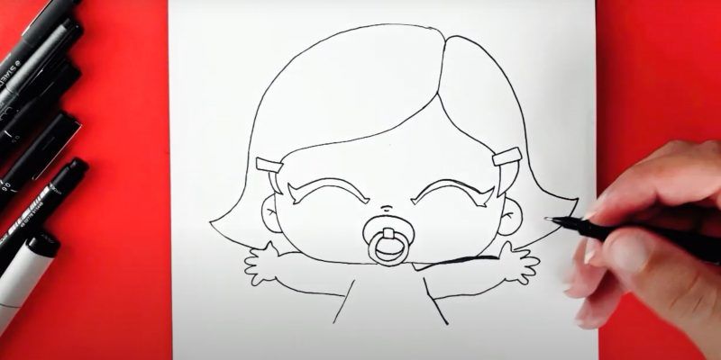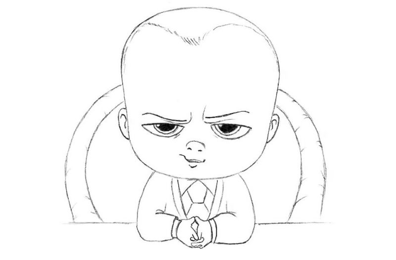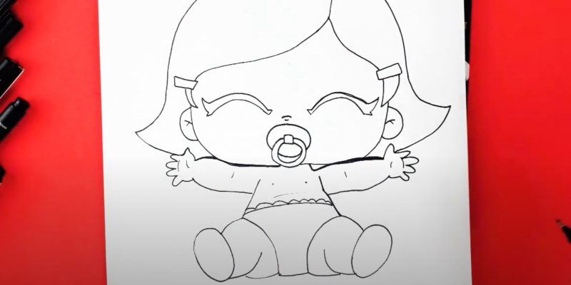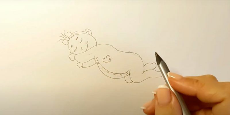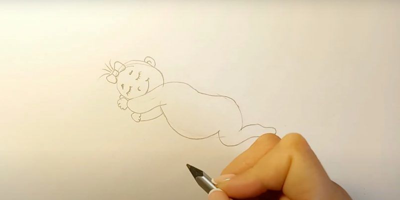 - Нарисувайте детайлите на бебето, като ясно подчертаете очите, ушите, носа и устата, без да забравяте анатомичните особености.