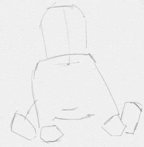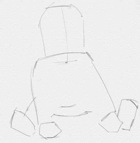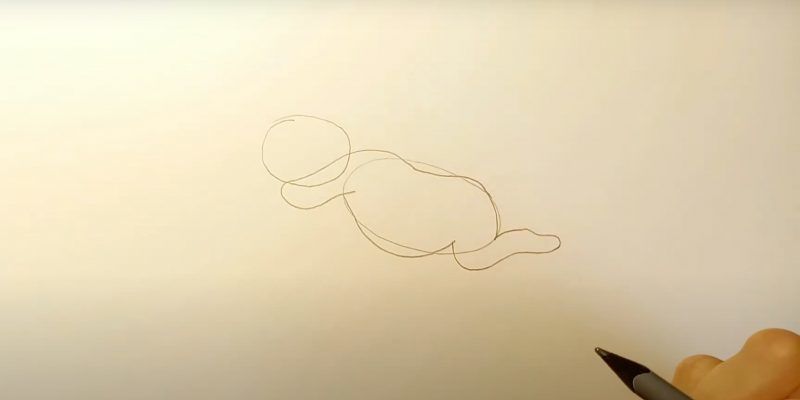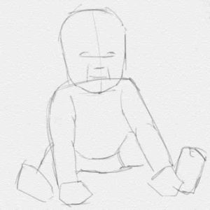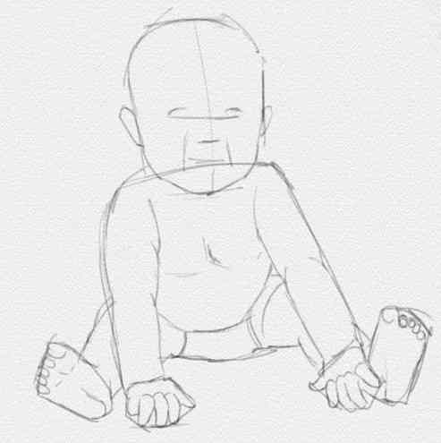 - Започваме със скициране на торса със средно твърд молив. Главата е леко наклонена надолу. Ръцете трябва да лежат на пода - те служат за опора на бебето.