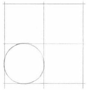 - В самото начало трябва да нарисувате квадрат върху листа, който след това да разделите на 4 равни части. В долния десен квадрат ще нарисуваме кръг - това е контурът на лицето на бебето.