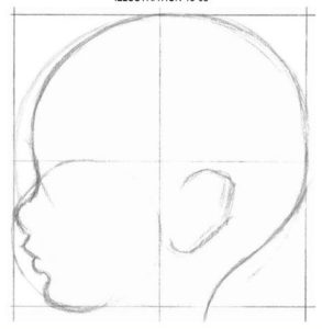 - Нарисувайте формата на лицето на бебето, заедно с устните, носа и брадичката в този кръг. Използвайте извитите линии в останалите части на квадрата, за да довършите главата на бебето, като по този начин завършите нашата скица.