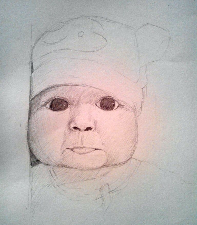 - Излюпваме детското лице, за да придадем обем на нашето творение. Засенчваме очите, носа и устата, защриховаме зеницата (тя е най-тъмната част от лицето на всеки портрет) и я размазваме с гумичка.