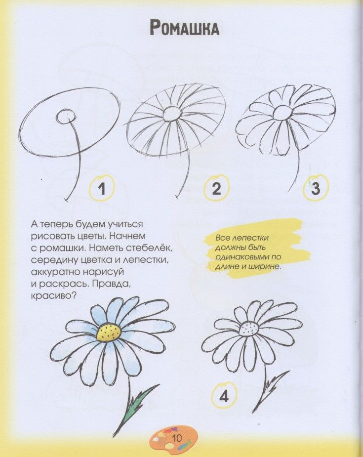 Това е всичко. Отначало рисунката, разбира се, трябва да се прави заедно с бебето, като се показва и разказва подробно последователността на изображенията на едно цвете, а по-късно детето ще се справи лесно.