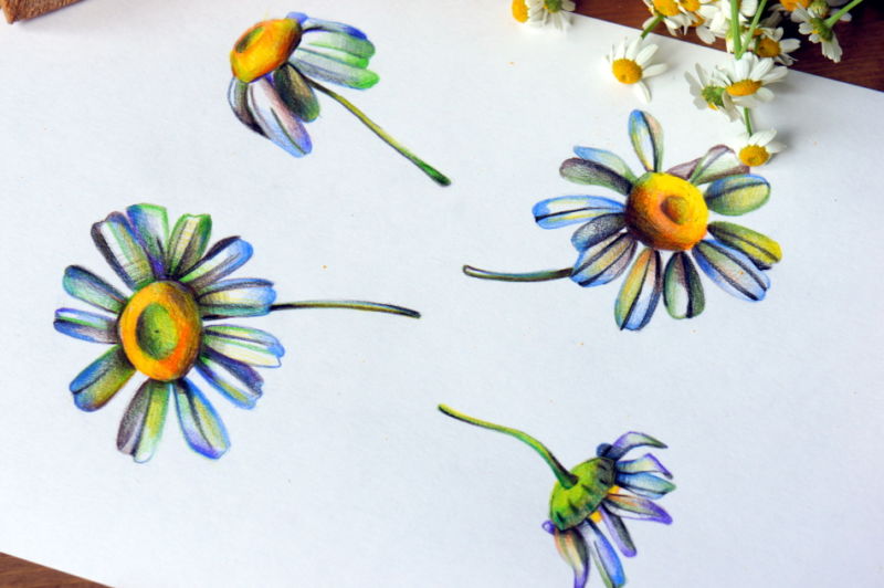 При първия метод за центъра се използват жълти и оранжеви моливи, за стъблото и листата - светло и тъмнозелени, а за венчелистчетата - сини.
