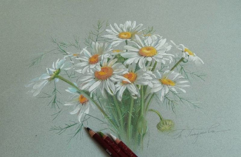 По този начин рисуването на цвете наистина не е толкова трудно. Необходимо е само да запомните последователността на рисуване на пъпката и цялото растение. След като разберете как да нарисувате маргаритка стъпка по стъпка, няма да ви е трудно да нарисувате букет от маргаритки.