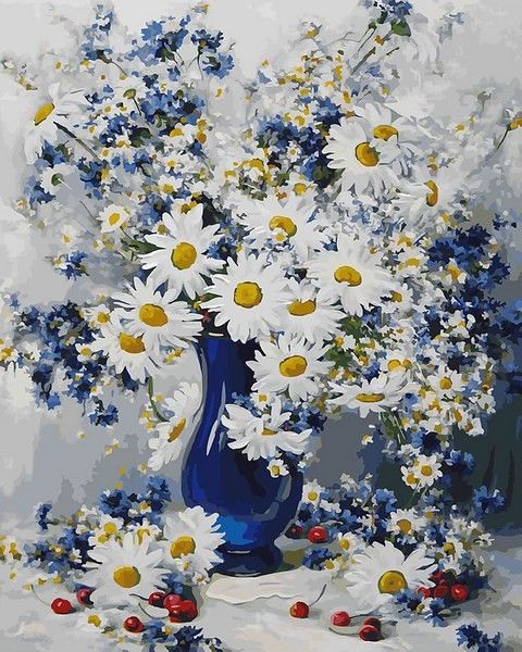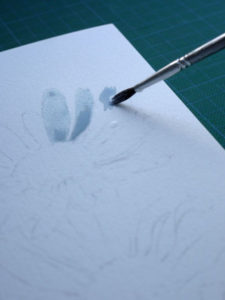 - Добавете акценти към венчелистчетата, като нанесете синя боя (комбиниран бял и син гваш).