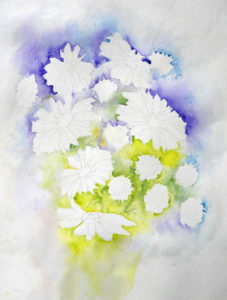 - Цветя: може да се използва произволен брой. Нанесете с четка бял гваш, за да направите отпечатъци на венчелистчетата.