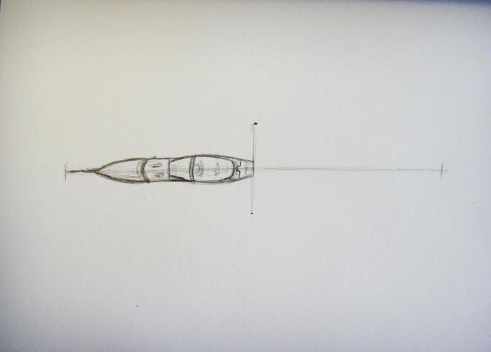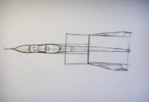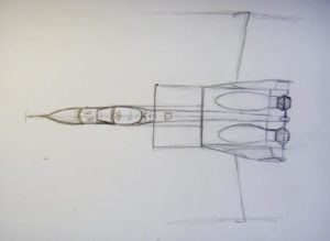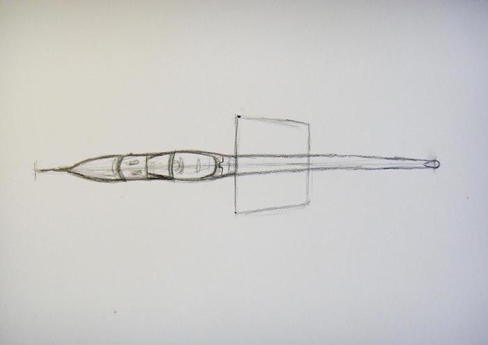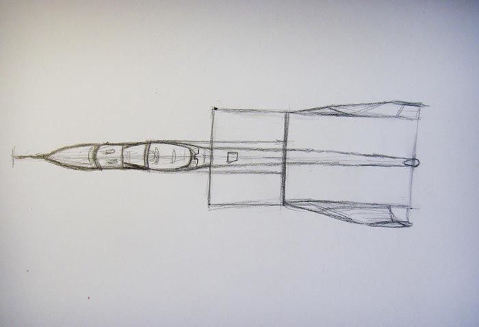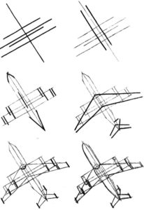 - От дясната страна довършете рисуването на 2 линии, които се свързват под ъгъл от около 60°. След това по тези линии се очертават контурите, необходими за оформяне на опашката на самолета.
