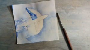 - С помощта на дебела четка нарисувайте облаците с бял гваш.