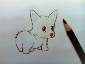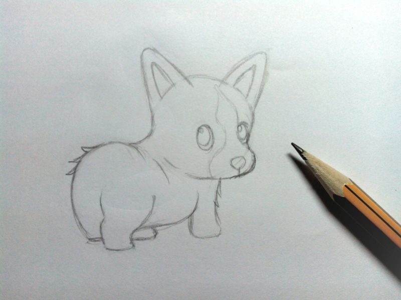 - От фигурата, показана в стъпка 14, начертайте извита линия нагоре. Това ще бъде скицата на опашката на кученцето.
