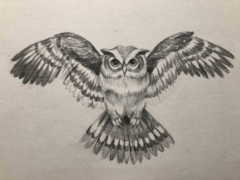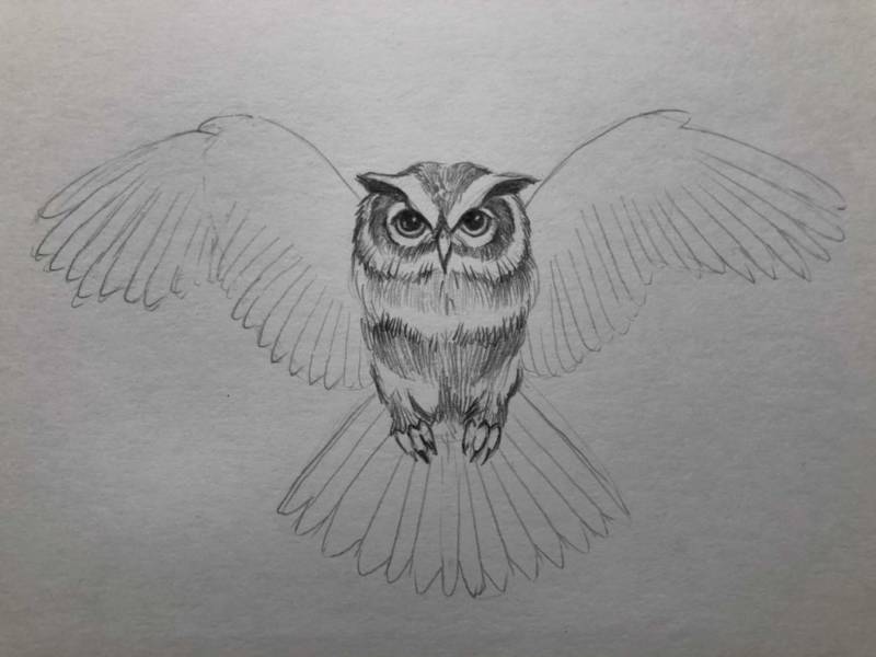 Просто потъмнете някои участъци на крилата с мек молив. Добавете сенки и върху опашката. Това ще придаде обем на бухала и ще го направи по-реалистичен.