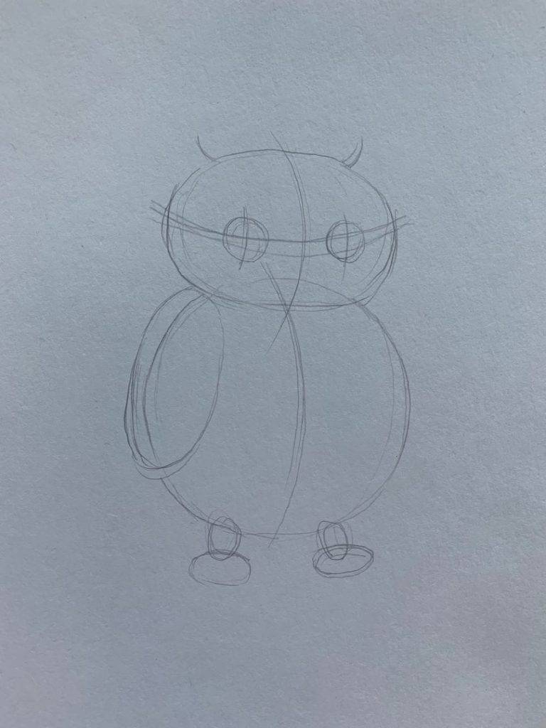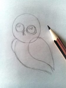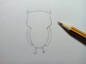 След това прекарайте линия през кръга и овала. Тази права линия ще служи за ос на тялото. В допълнение към шията на совата свържете главата с торса с полукръгли линии.