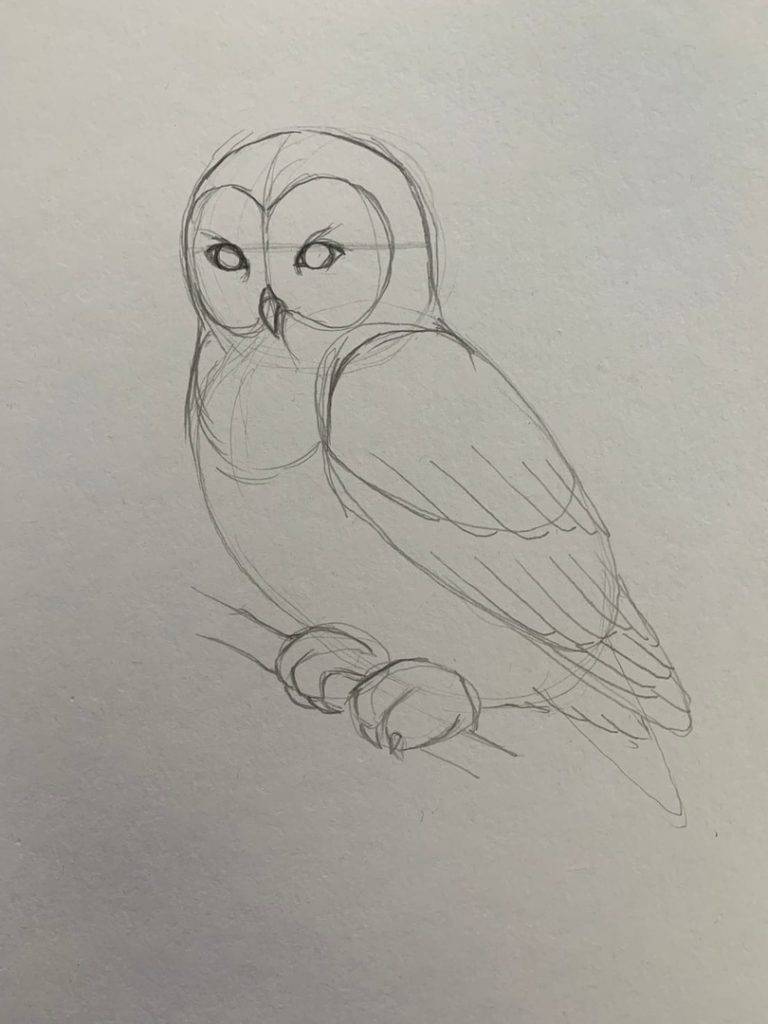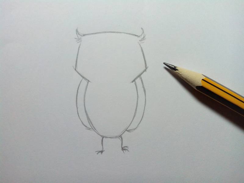 Вземете средно мек молив и нарисувайте формата на совата. Използвайте най-простите геометрични фигури за тази цел. Използвайте кръг за главата и овал за торса. Крилото трябва да посочи и овала. Също така трябва да се добави остър връх от долната страна. След това овалните форми показват краката, а триъгълникът - ръба на опашката.