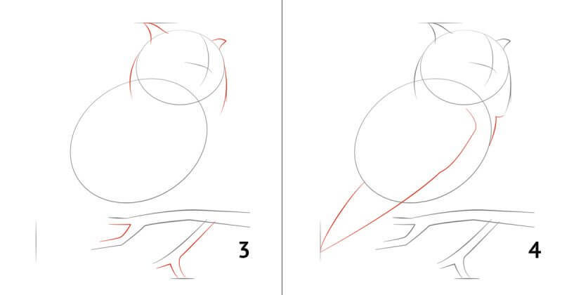 Ето още един начин да нарисувате страхотна картина на бухал. В това изображение тя ще бъде поставена на клон на дърво. Както и предишния път, трябва да започнете със скица. Опитайте се да намерите снимка на бухал на клон и я поставете пред себе си като модел.