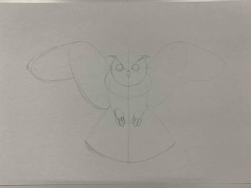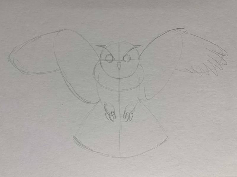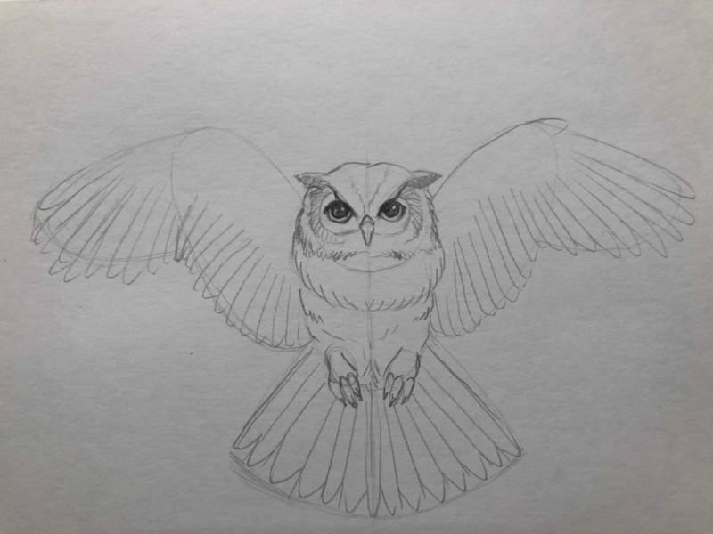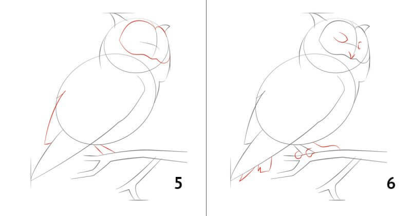 Придайте повече подробности на получената птица. На този етап покажете ушите, човката, очите и зениците на совата. Освен това по-ясно проследете крилото. На лапите добавете овални пръсти. Опашката също трябва да бъде проследена. Задното крило ще се подава иззад тялото на бухала, така че трябва да покажете ръба му. Използвайте големи форми, за да получите светлата част на главата на бухала.