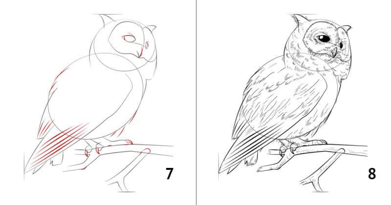 По-добре е да уточните всички форми, да изострите преходите, да проследите перата. След това можете да изтриете ненужните линии с гумичка. Когато се отървете от ненужните щрихи, покажете характера на очите на совата и добавете повече детайли.