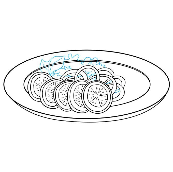 Засега не е необходимо да проследявате дъното, както направихме преди. Вътре трябва да се постави марулята. Нарисувайте много зелеви листа, резени домати, резени краставици, можете да добавите още малко зеленина.
