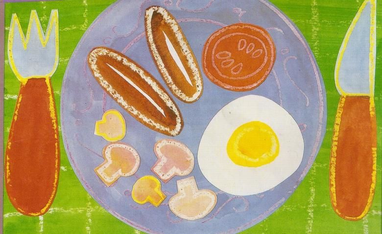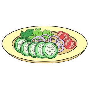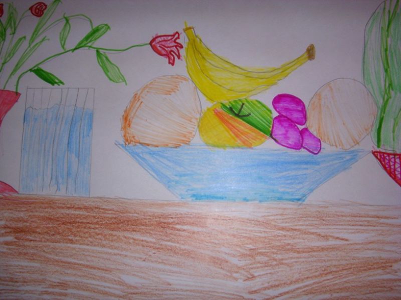 Фрагменти от зеленчуци се оцветяват с цветни моливи, а страните на чинията, които се виждат от вътрешната страна, могат да се засенчат по определен начин, за да се придаде обем.