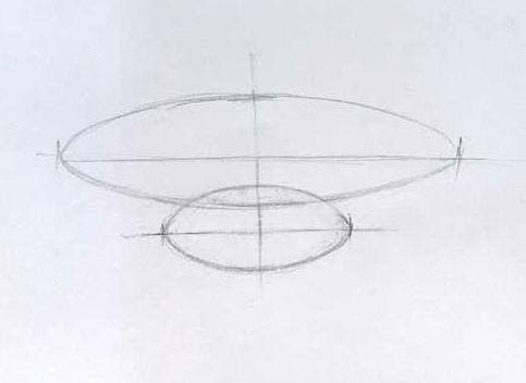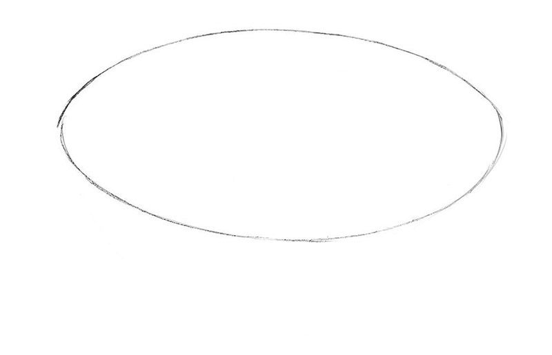 В основата на страничното изображение на плоска плоча се намира овал. За да бъде овалът плосък и пропорционален, трябва да очертаете помощни линии и знаци с мек и лесен за отстраняване молив.