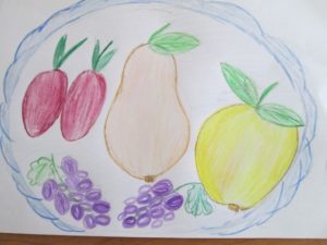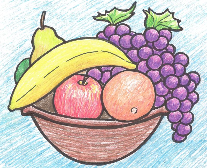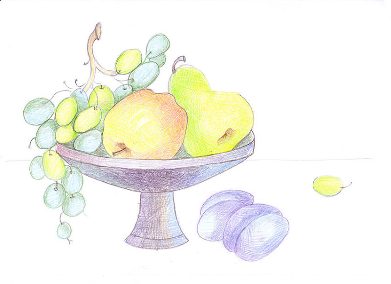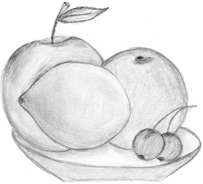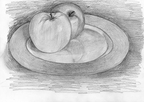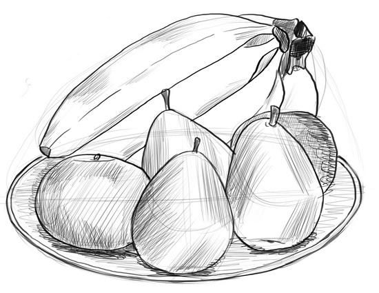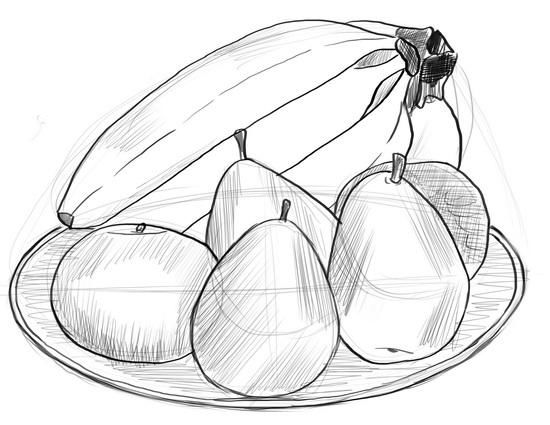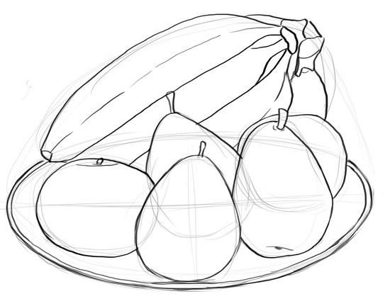 Когато е нарисувана "голата" чиния, всички избрани плодове трябва да бъдат поставени в нея подредено и естествено. Важно е да знаете как да рисувате плодовете. Ябълката например може да се нарисува, като се започне с кръг и се върви напред-назад между кръговете. Крушата също се рисува, като се започва с кръг.