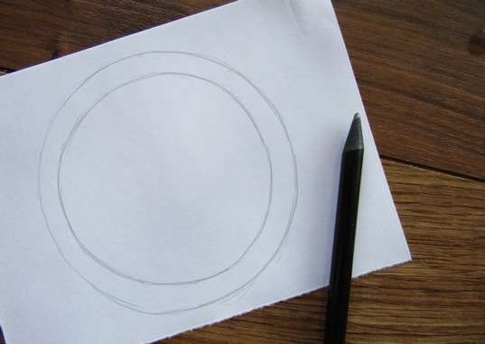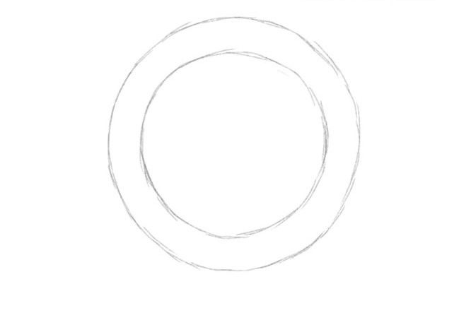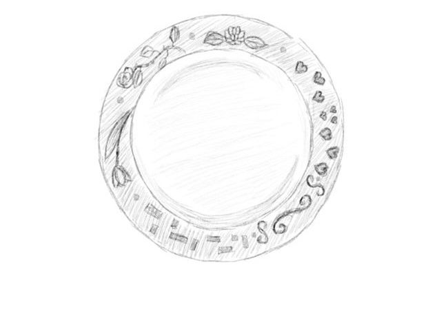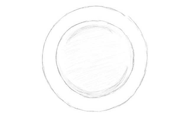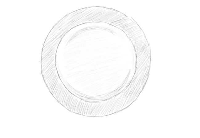 Около нарисувания кръг се начертава друг кръг, който служи за странични ръбове на плочата. Основната част на плочата е готова. Единственото, което остава да направите, е да направите изображението триизмерно, за да не изглежда просто.