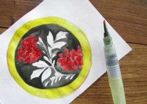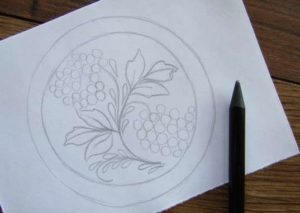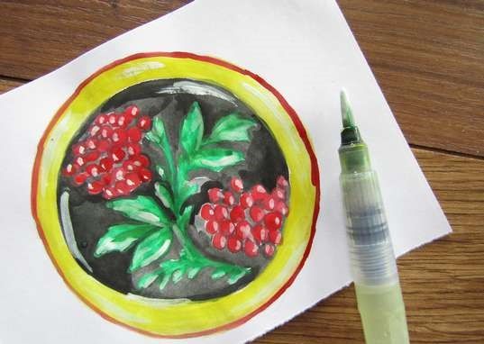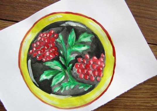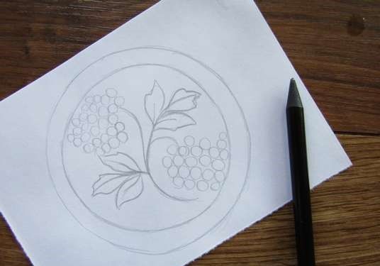 Можете да нарисувате прост вътрешен модел под формата на вихрови линии или на вече споменатите цветя, стъбла и листа. В по-опростен вариант не е необходимо да се придържате към естествеността на сенките, можете да се справите и без тях. С помощта на цветни моливи добавете цвят в чинията.