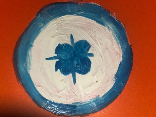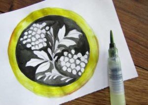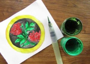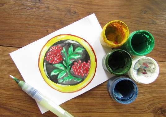 Около чинията по ръба има всякакви цветя, стъбла, листа, а за разнообразни флорални мотиви можете да добавите пчели, пеперуди и други животинки.