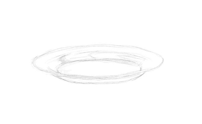 Ще нарисуваме чиния с плодове отстрани. Вече в обичайния ред на работа нарисувайте плочата, както е описано във втория вариант, но не е необходимо да прилагате сенките и засенчването предварително.