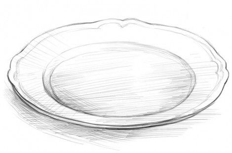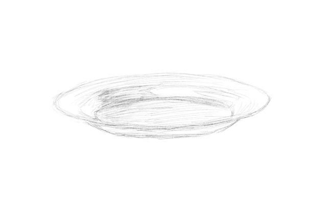 Този път се опитайте да нарисувате плочата с кръстосана скица. Започнете с овала на чинията. След това, за да се раздели на зони за по-лесно рисуване и пропорции, се рисува кръст с мек молив. Начертава се още един овал точно в центъра на овала спрямо очертанията на кръста.