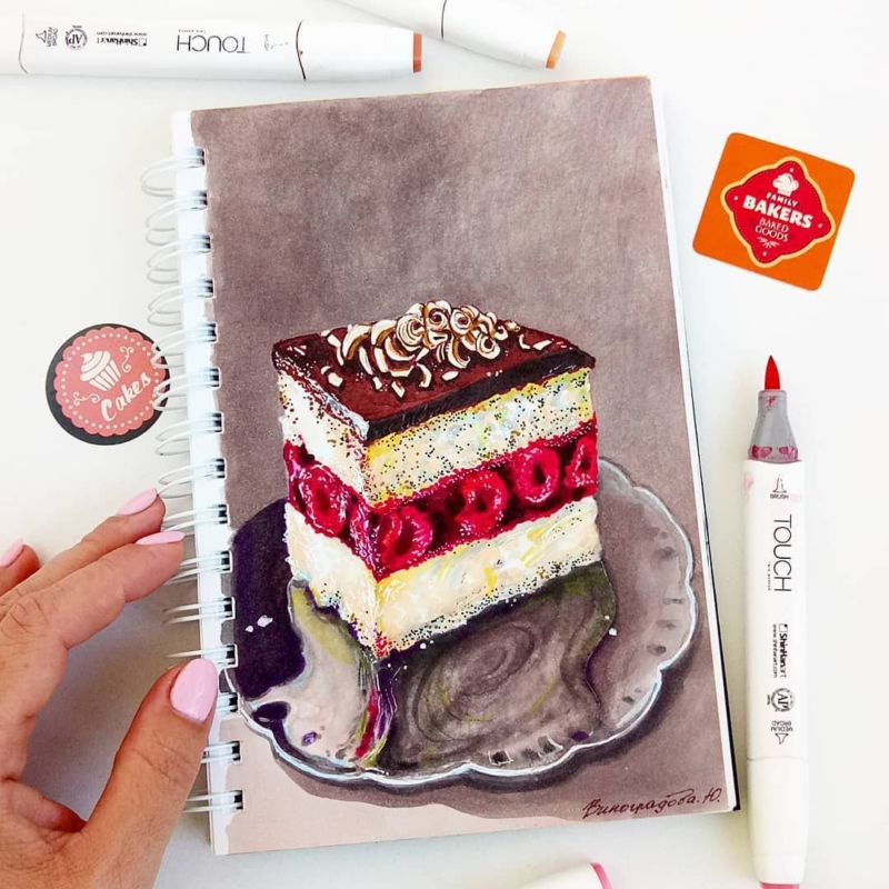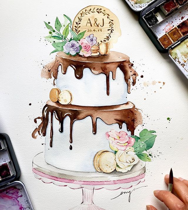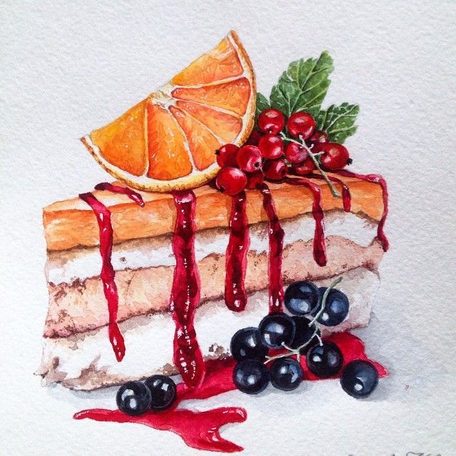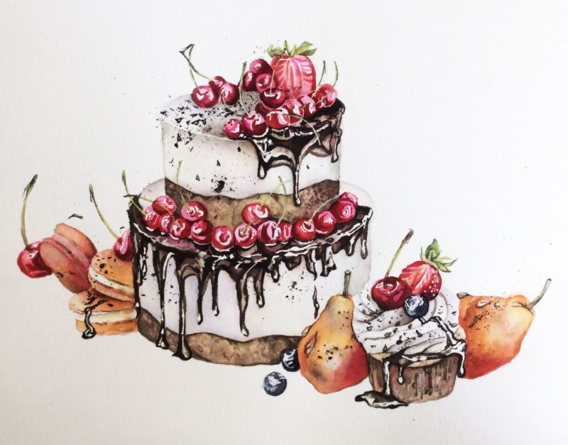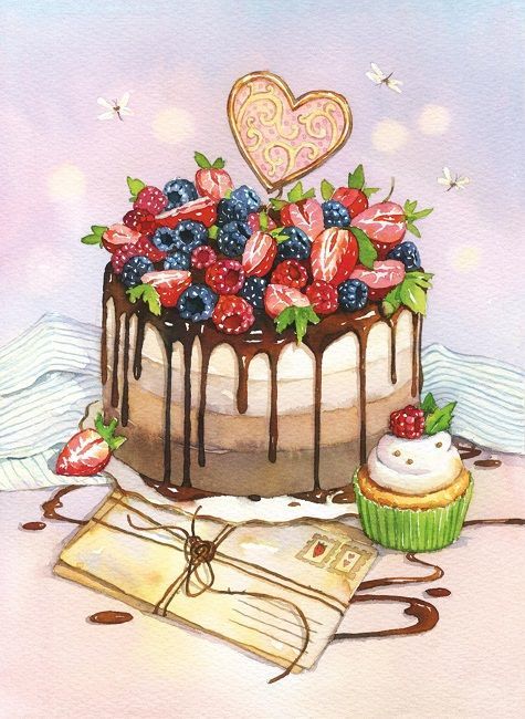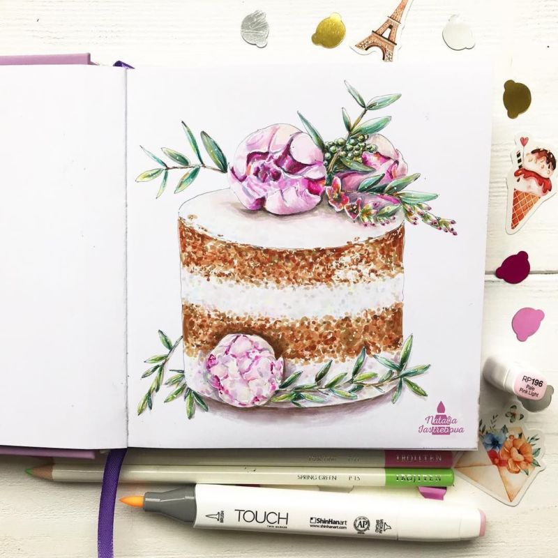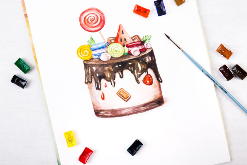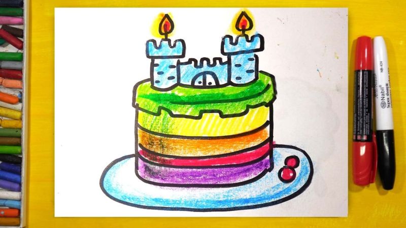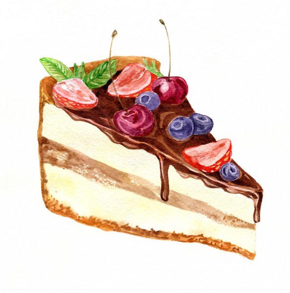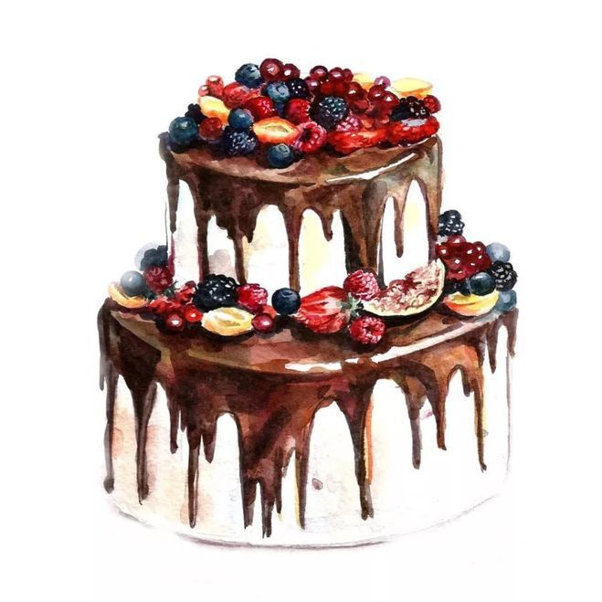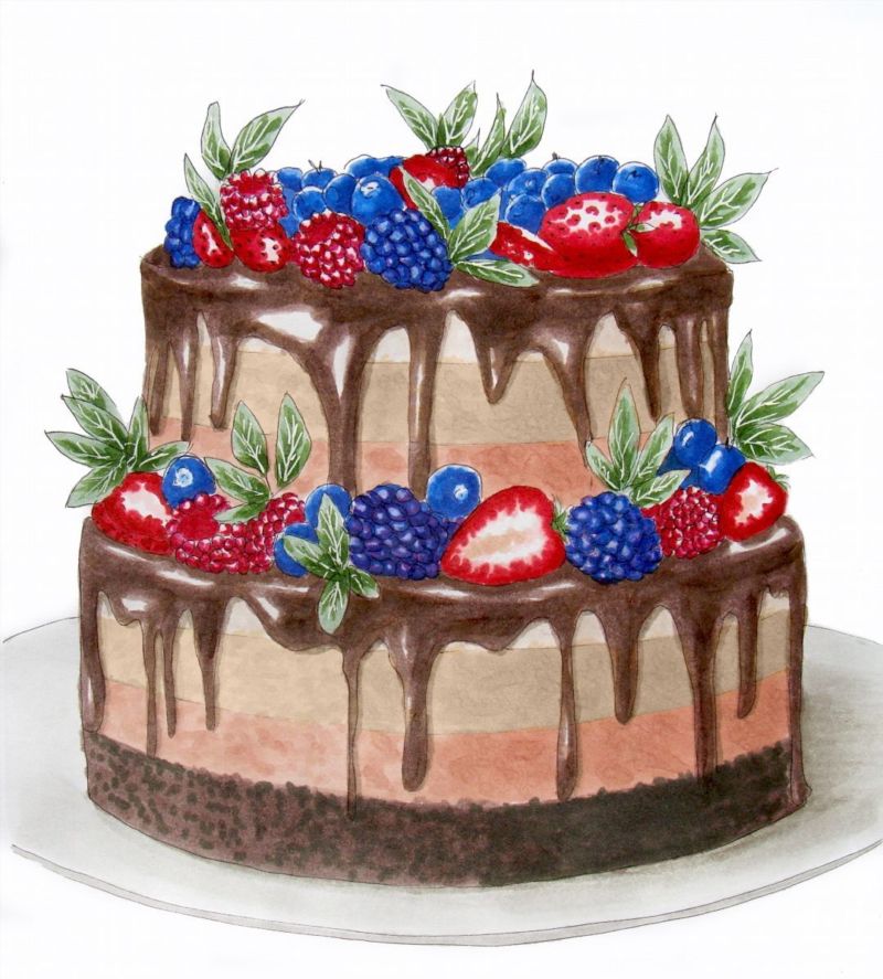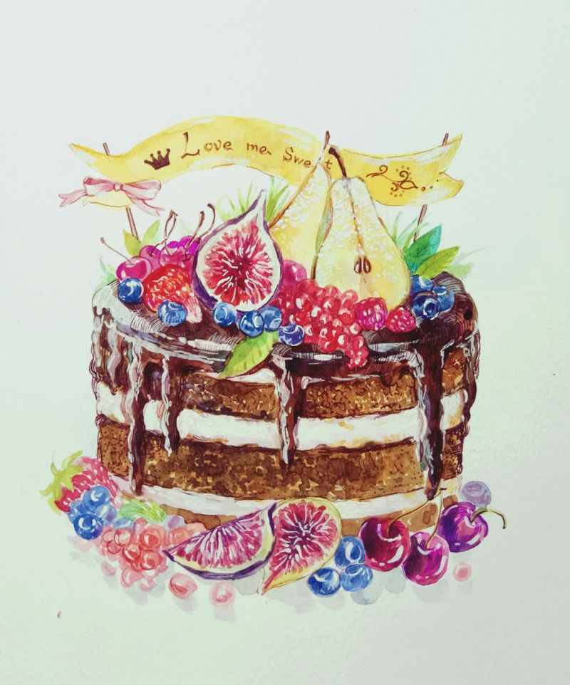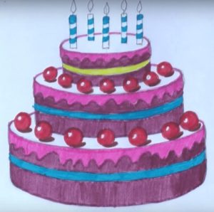 По-добре е да нарисувате такава торта с акварелни бои или гваш. Първо изтрийте помощните линии и очертайте всички контури с молив. След това можете да вземете четка. Важно е да изберете правилната боя за желания ефект.