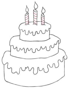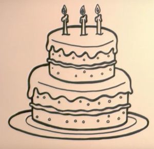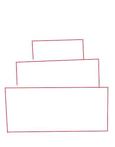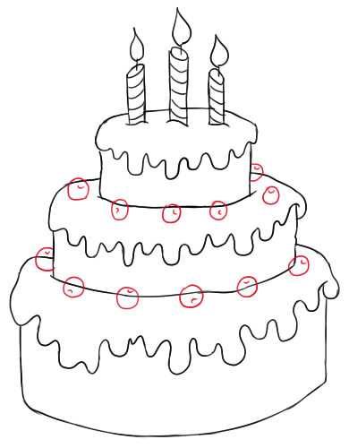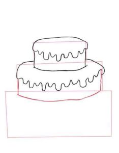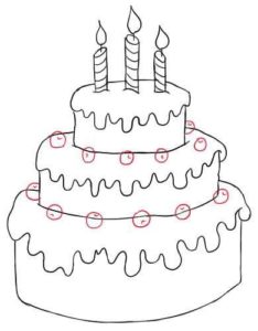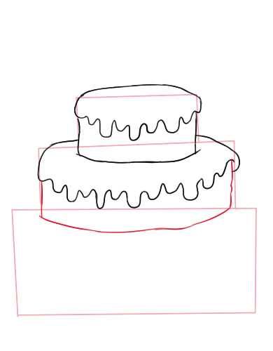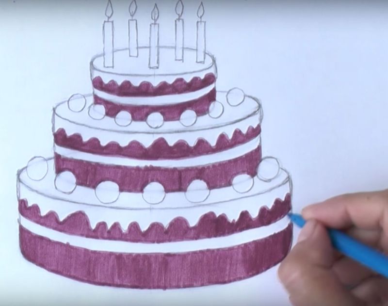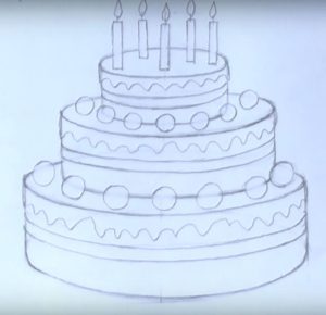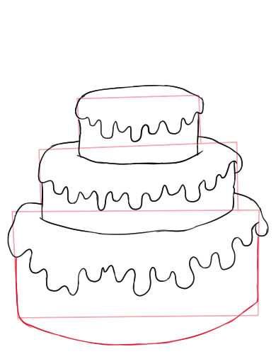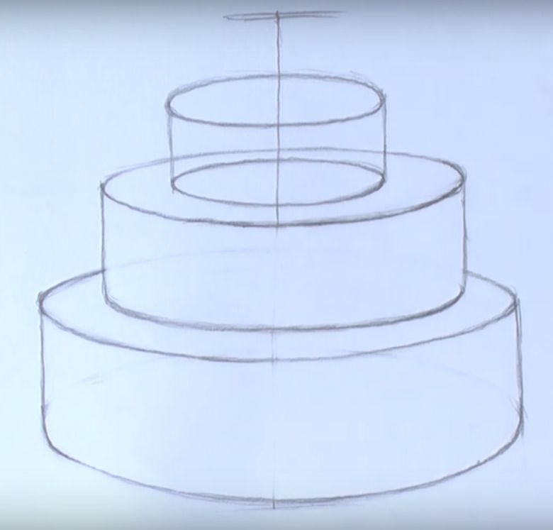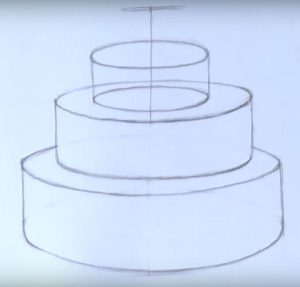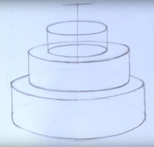 - Нарисувайте с молив още три етажа на тортата, всеки с по-малък диаметър от предишния. Това ще придаде на сладкия десерт завършен вид;