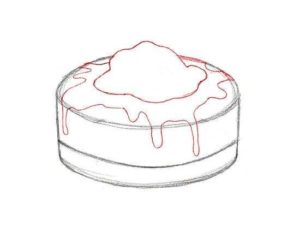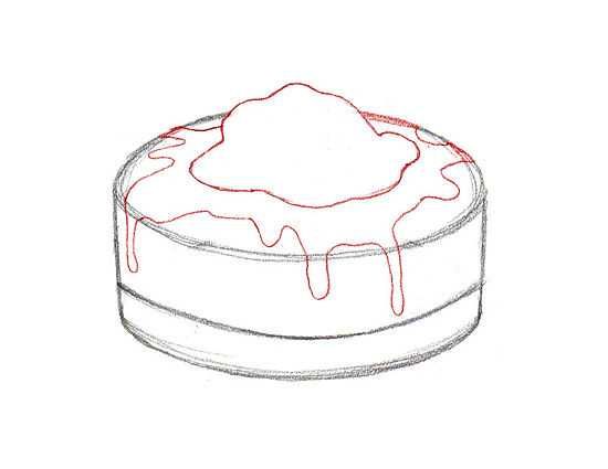 - Следващата стъпка е да се нарисува скица на ягода и сироп, който се стича върху горната част на тортата.