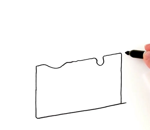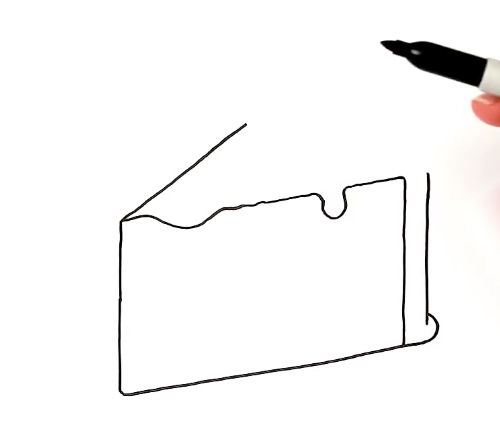 - Рисуването на тортата започва с глазурата. Начертайте дълга, тънка линия със заоблени краища. В долната част е нарисувана вълнообразна ивица, която символизира стичащата се глазура.