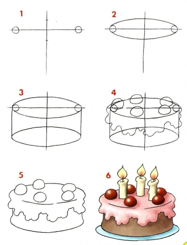 Използвайте това описание, за да се запознаете с начина на рисуване на торта стъпка по стъпка. Дори дете в предучилищна възраст може да се справи със задачата. Възрастните могат да проследят правилното изпълнение на всички стъпки на рисуваната торта.
