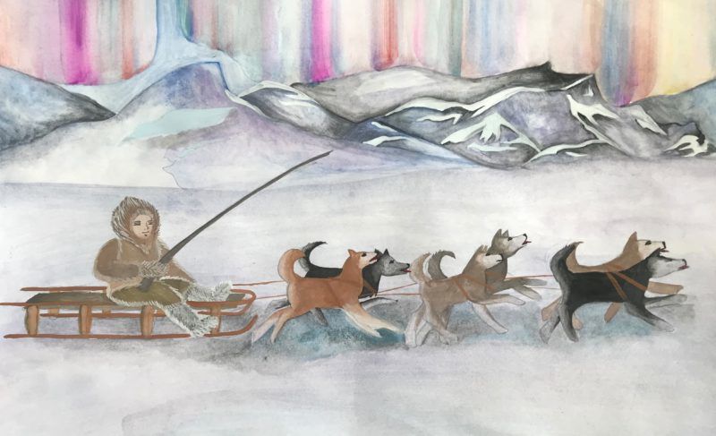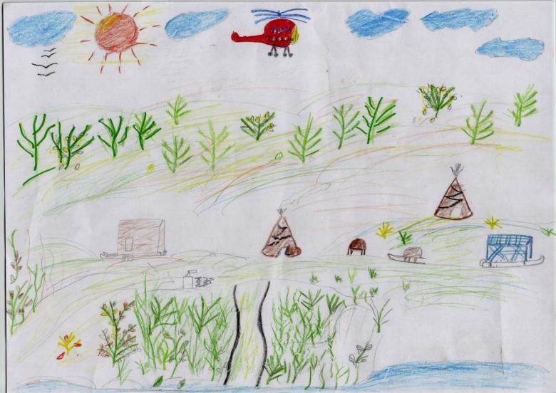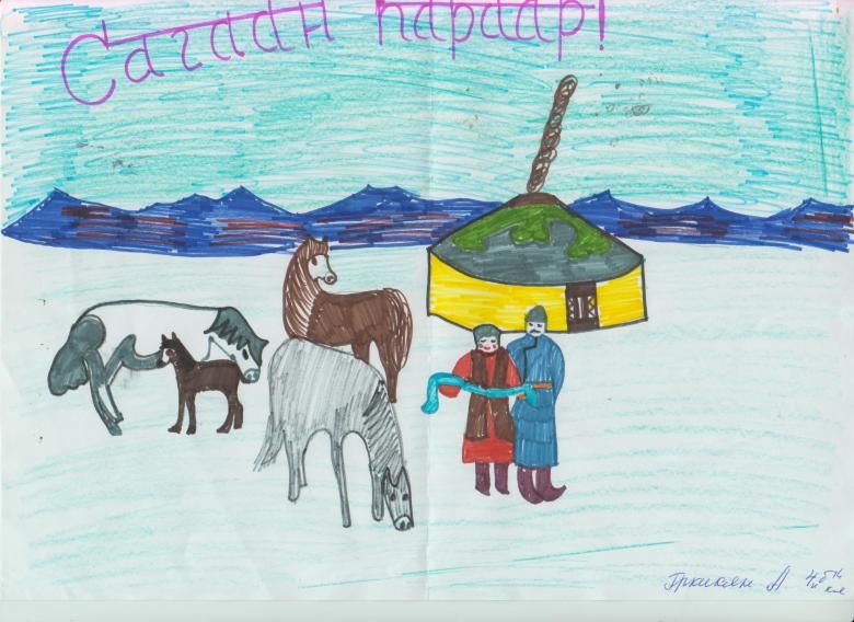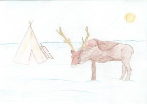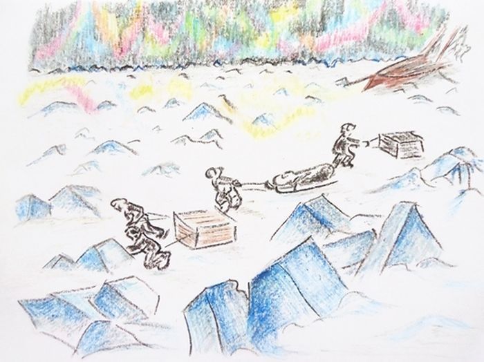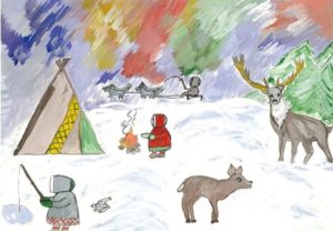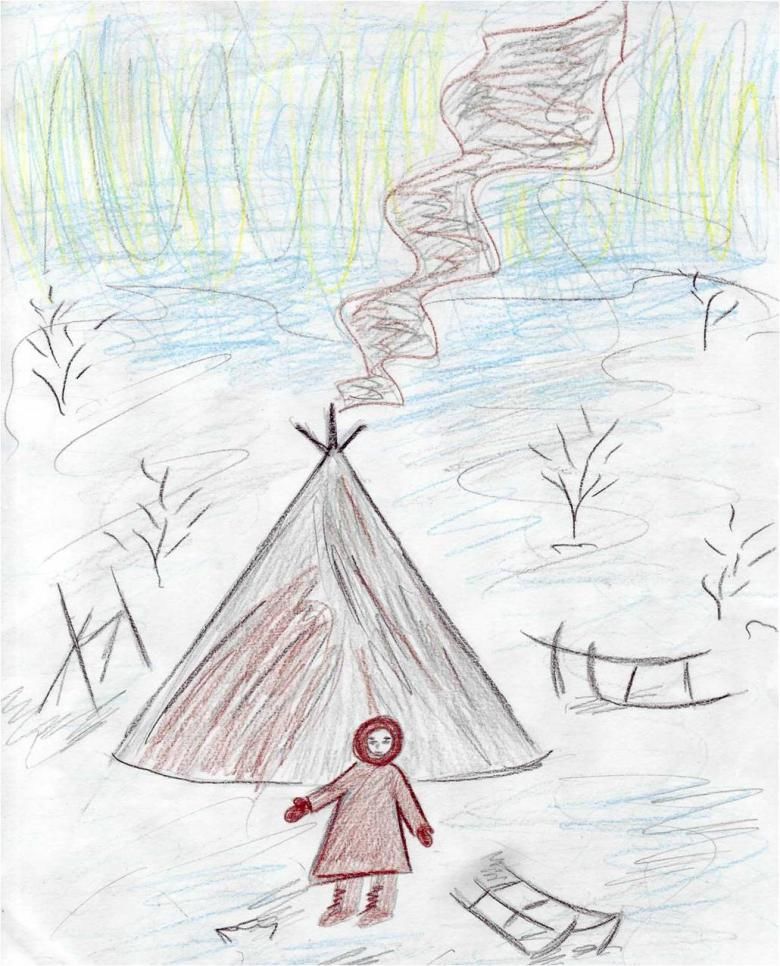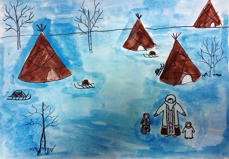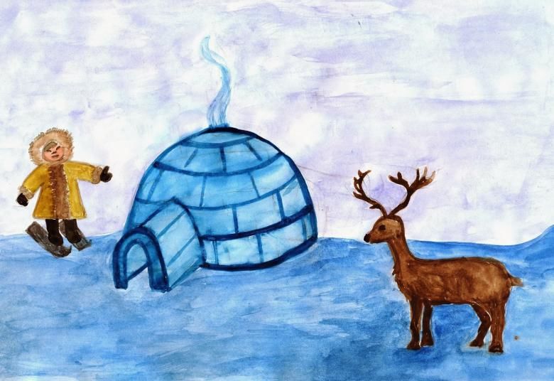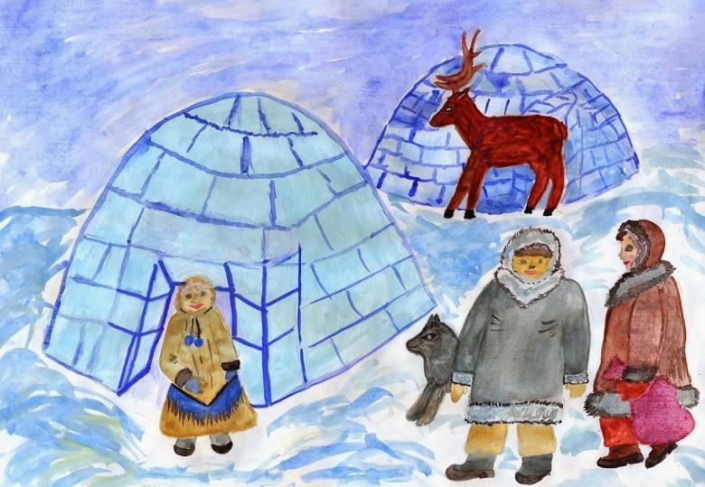 - Можете да изобразите коренното население и неговите характерни жилища. Имайте предвид, че през зимата националните жилища са иглута. Те са направени от ледени блокове. А през лятото и когато няма сняг, местните жители издигат юрти. Това са палатки с цилиндрична форма, изработени от животинска кожа и плат.