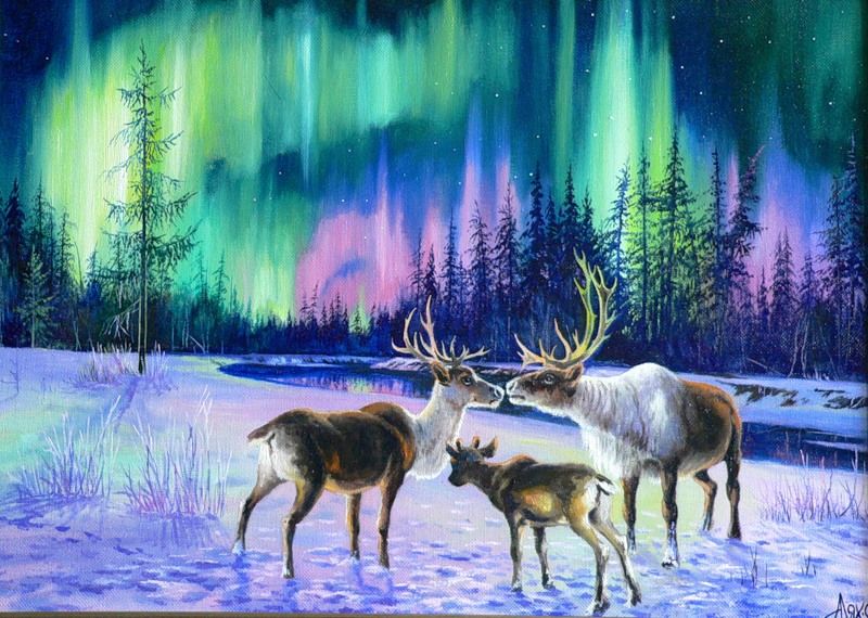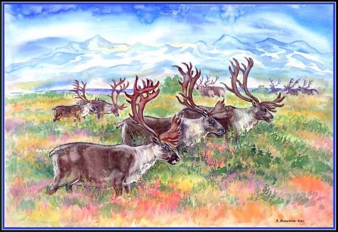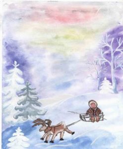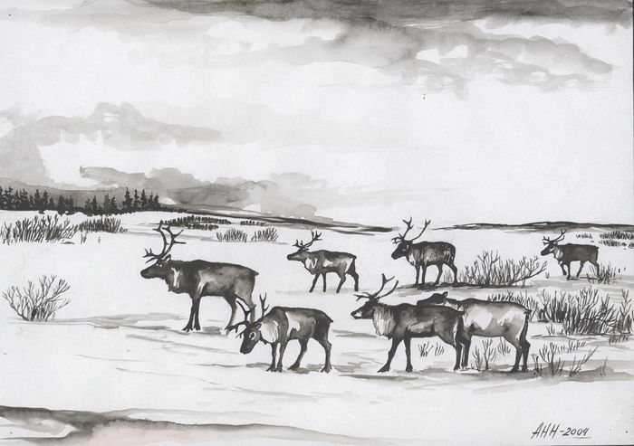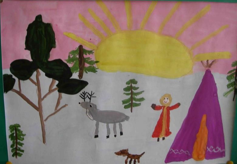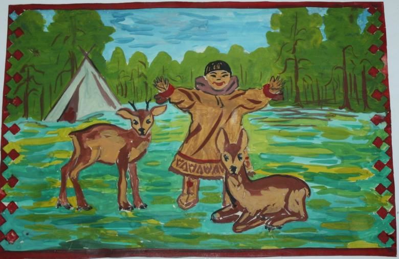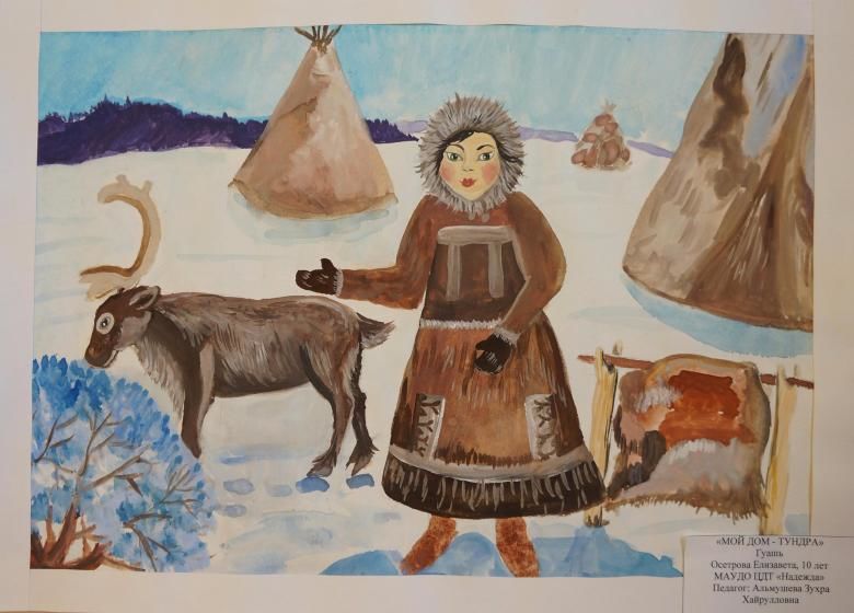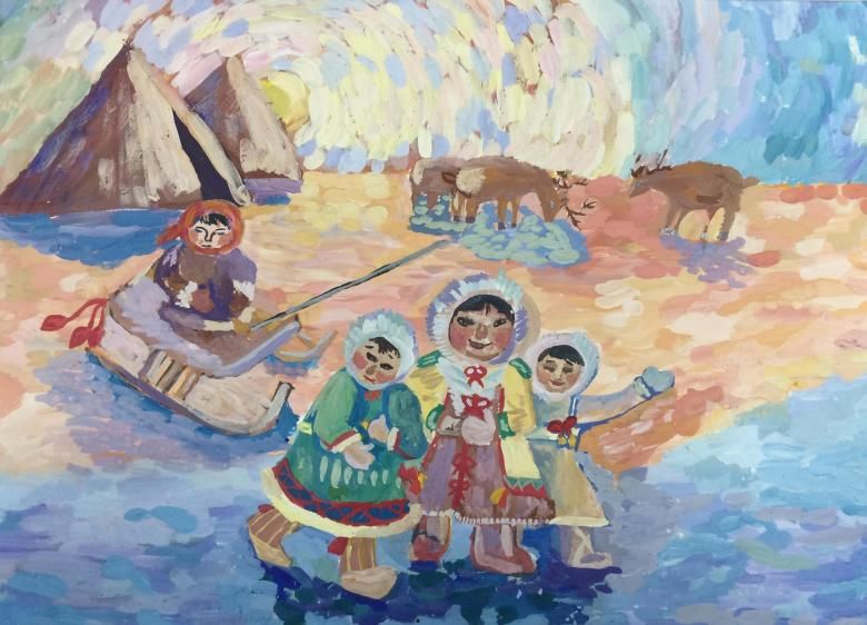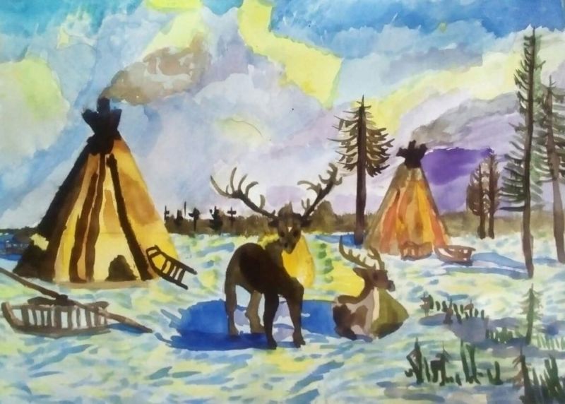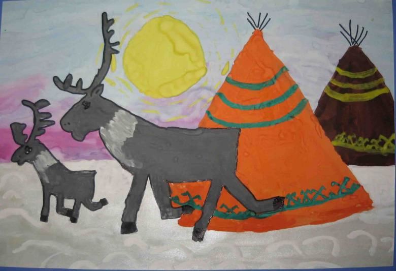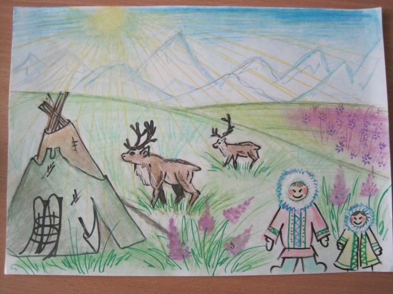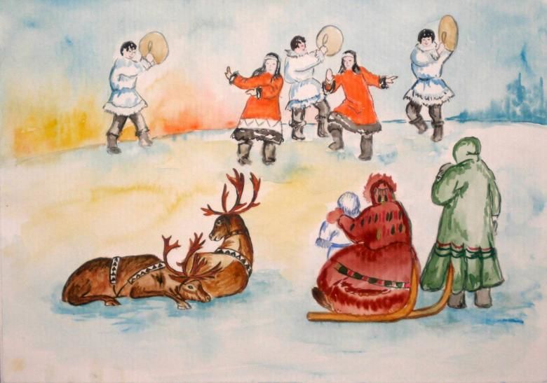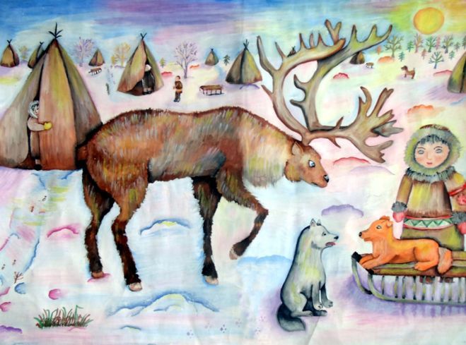 - Когато си представяте хората, си струва да си спомните и за националните носии, които представляват дълги кожени палта, украсени с орнаменти. Носят се през по-голямата част от годината - тук е студено почти през цялото време. Когато в тундрата стане по-топло, дългите кожени палта до земята се заменят с по-къси, широки орнаментирани колани, които се пристягат около кръста на жената. Мъжките панталони се допълват от особени сака, които също са с колан и кожена обшивка по ръба. От традиционните елементи на живота шейната със северни елени е задължителна. Понякога се използва кучешки впряг, така че този приятел на човека може да бъде изобразен и в тундрата.