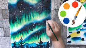 - По същия начин нарисувайте долната част на картината, където се намира самата тундра. На мястото на свързване на двете зони се опитайте да избегнете смесване на боята.