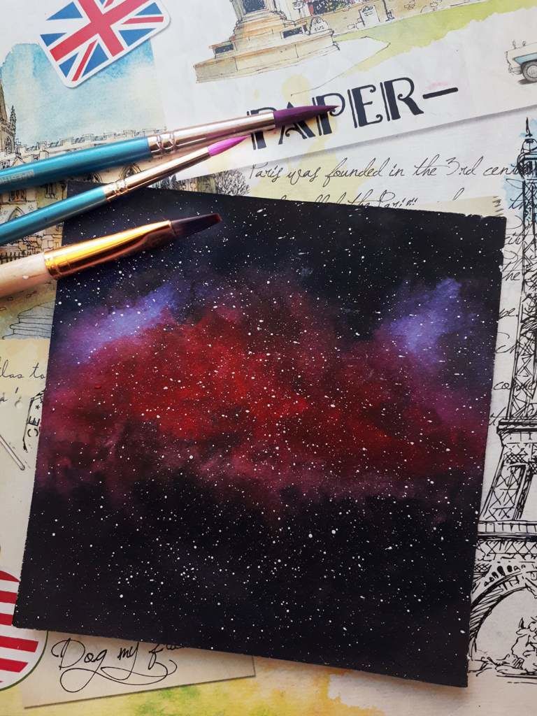 - Навлажнете хартията, за да създадете цветен градиент. Нанесете тъмни и топли цветове отгоре. Последните се добавят в близост до хоризонта. Използвайте цветове като лилаво, сиво, ултрамарин, оранжево и жълто. Създайте жълто сияние за звездите, пространството в близост до петната от маскираща течност.