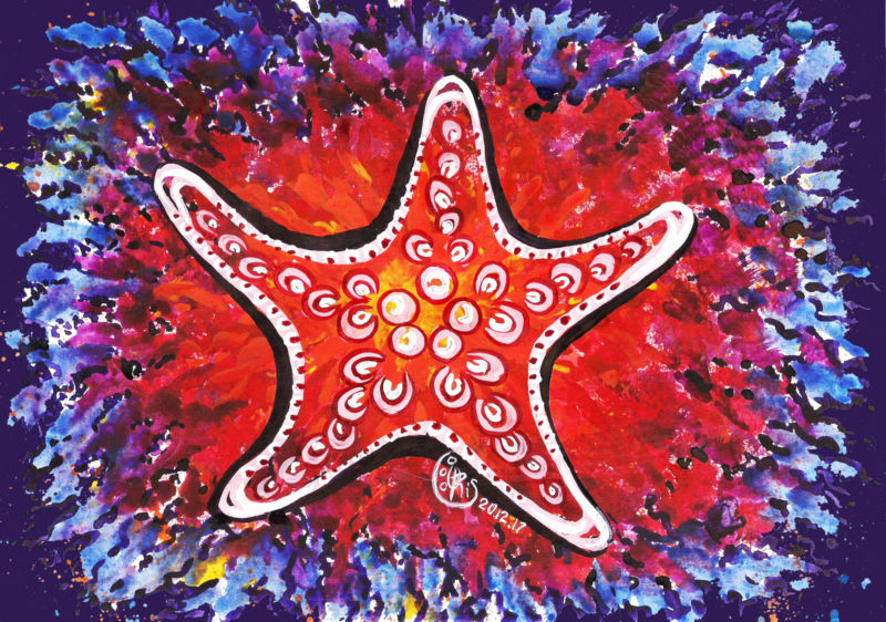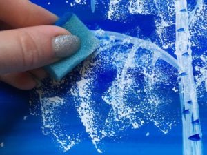 - Сега можеш да се отправиш към звездите. За целта използвайте бял гваш или акварел с достатъчна консистенция. Разпръснете боята върху листа, като потупвате четката с другата дръжка.