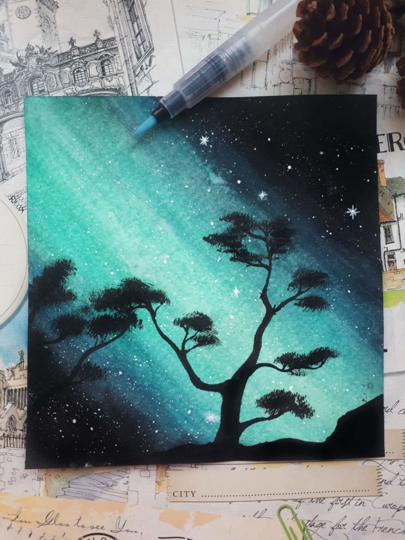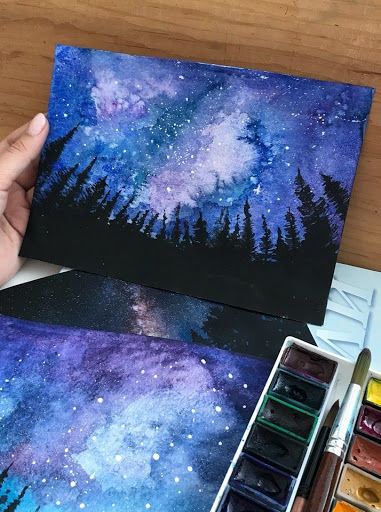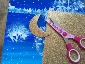 С помощта на маскираща течност създадохме магия върху листа хартия. Рисунката на нощното небе е завършена.