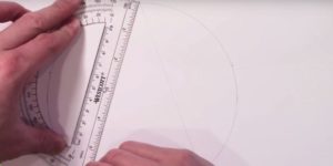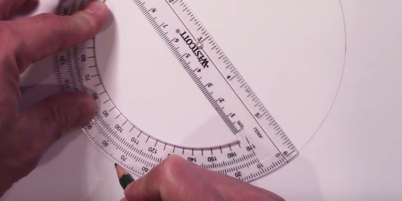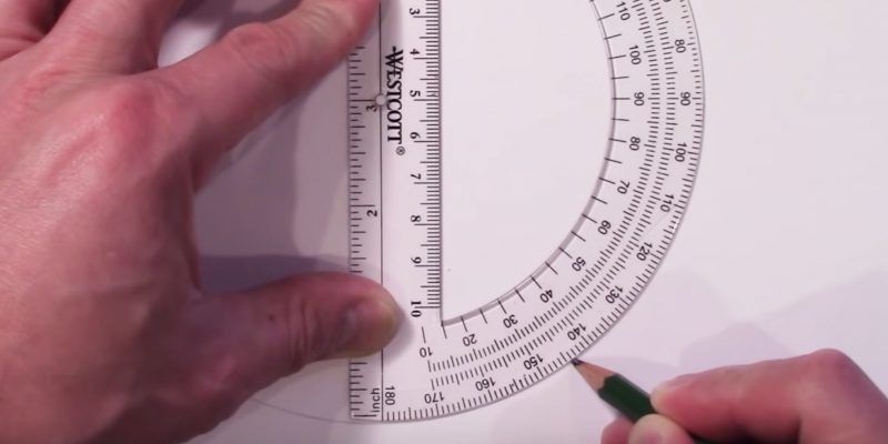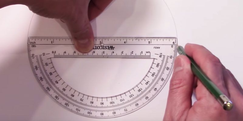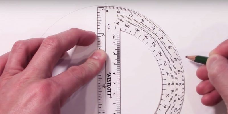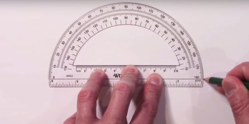 - Поставете транспортира върху хартията и очертайте заоблената част с молив.