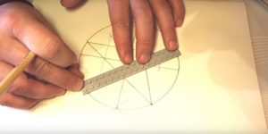 - Начертайте прави линии от центъра на кръга до всички ъгли на звездата.