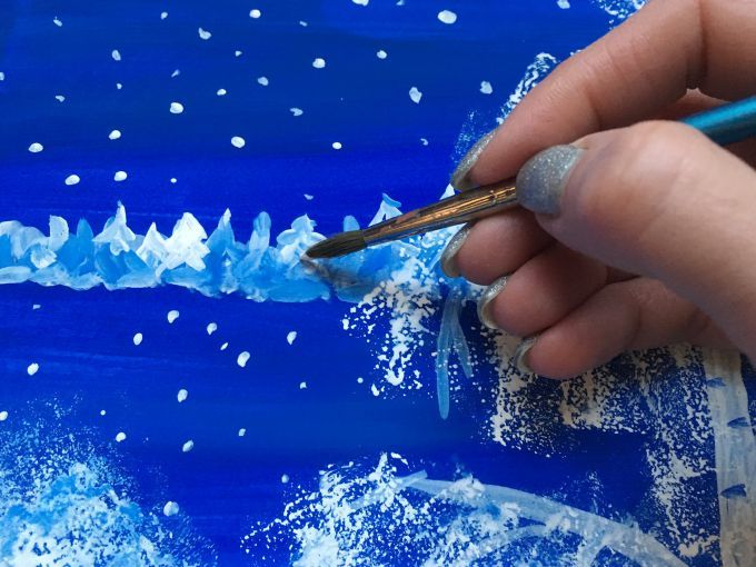 - Добавете щрихи към снежния хоризонт, като използвате светлосиня боя, за да подчертаете повърхността.