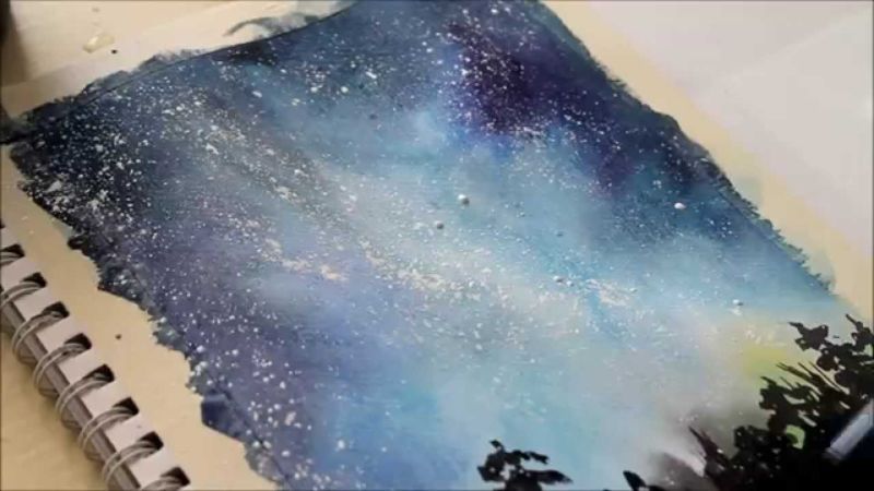 - В средата на листа нарисувайте Млечния път. За да направите това, отстранете цялата боя от четката и измийте наклонената ивица на снимката с вода.